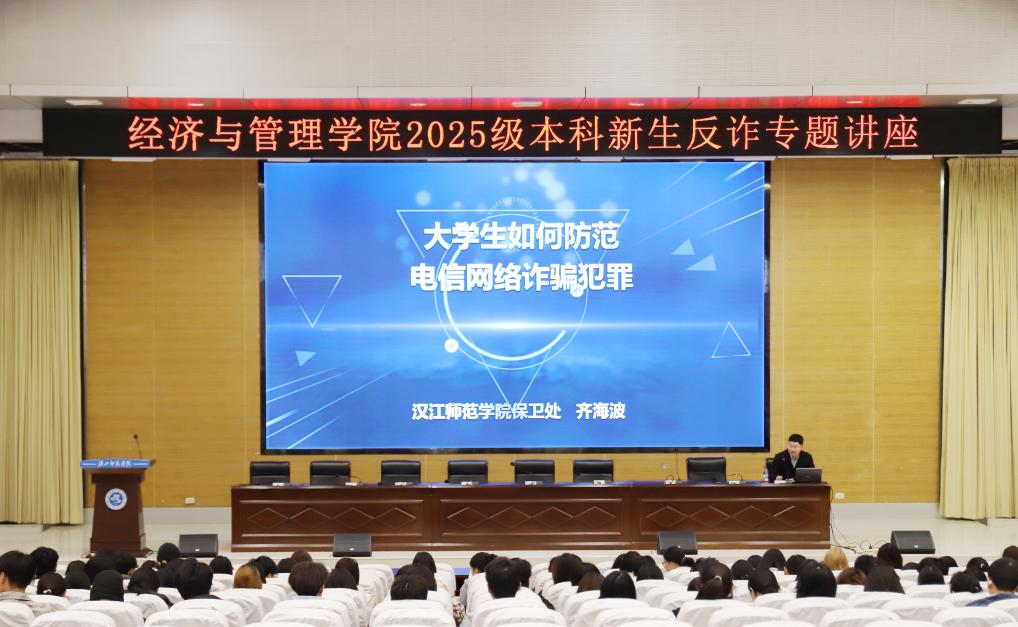 为提升新生防范电信诈骗意识,筑牢平安校园,10月23日下午3点半,williamhill威廉希尔在学术报告厅召开2025级新生反诈专题讲座,此次讲座由保卫处齐海波老师主讲,辅导员王旭、2025级全体本科新生参加。