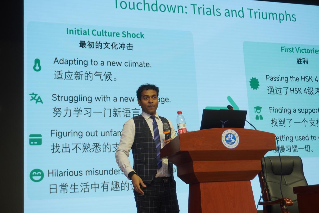 Addis以“知识促使成长”为主题,结合自身克服语言障碍、突破困境的求学经历,从积极进取的学习态度等维度,向同学们分享了学习经验与方法,激励大家勇于探索、勤奋向学。现场还设置了双语演讲、互动问答等环节。Addis博士幽默风趣的讲述引发阵阵掌声,气氛热烈,反响积极。