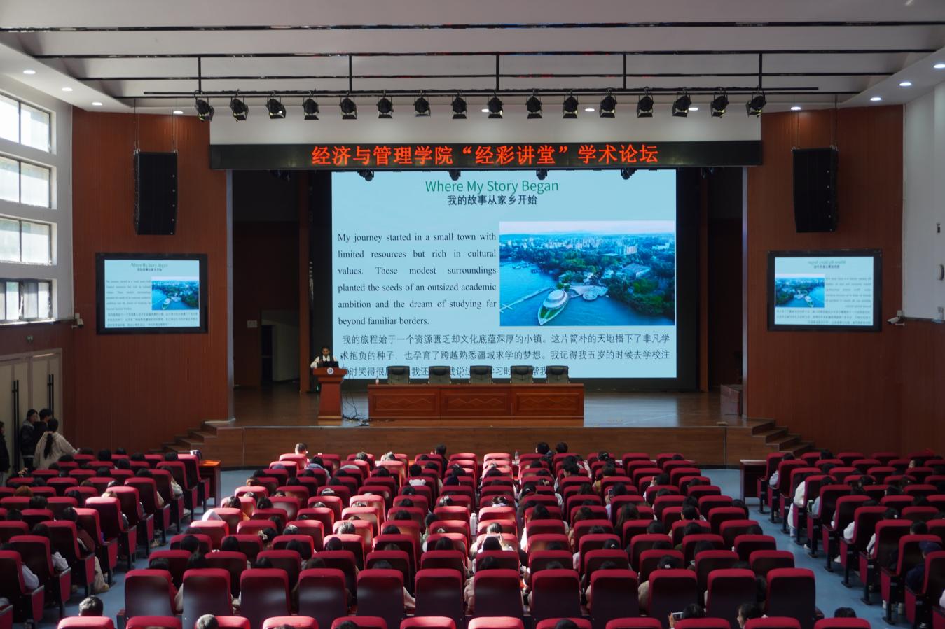 11月20日下午,williamhill威廉希尔“经彩讲堂”在丹江口校区沧浪剧场成功举办。学院外籍教师Addis Amsalu Kendu博士担任主讲嘉宾,院党委副书记张宇、大数据与会计专业负责人崔建忠、财务管理专业教师吴嵩及辅导员王菁、张涵出席,300余名师生现场聆听。